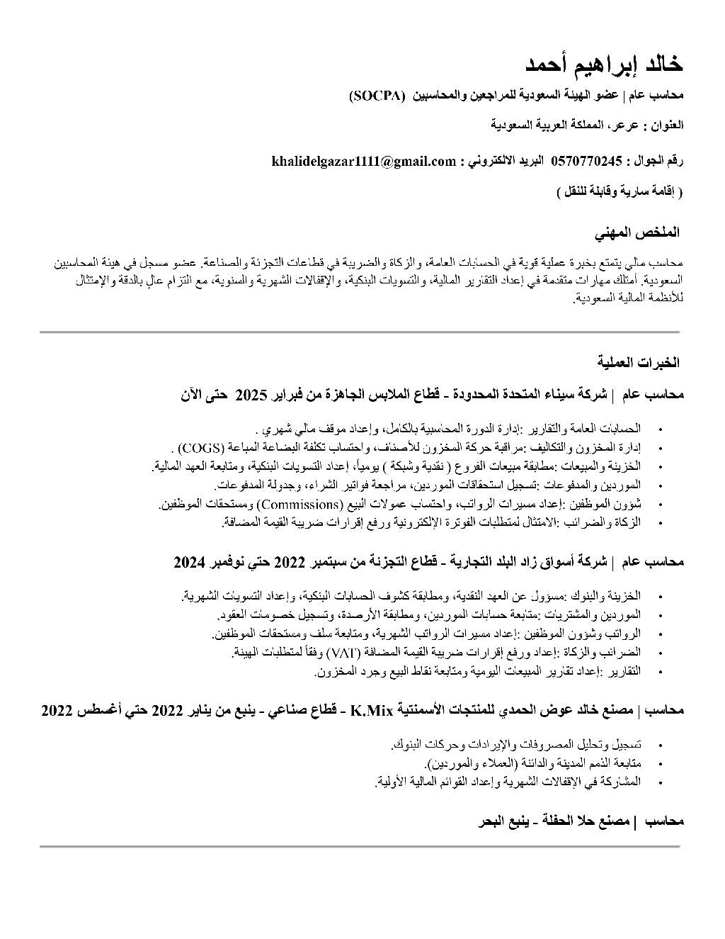 محاسب عام (عضو SOCPA) خبرة 4 سنوات بالسوق السعودي. الاسم خالد إبراهيم الخبرات اعداد التقارير الشهرية والسنوية، ضريبة (VAT) رواتب، مخزون، وبرامج محاسبية. الإقامة سارية وقابلة للنقل (مهنة محاسب) الموقع عرعر (جاهز للانتقال)