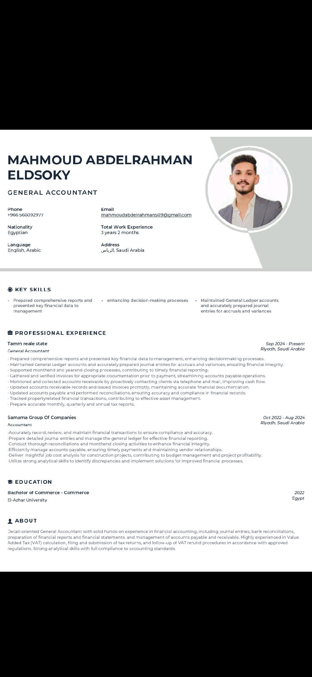 محاب عام لدية خبرة 4 سنوات في مجال المقاولات والتطوير العقاري والضرائب والاسترداد الضريبي وجاهز للعمل فورا