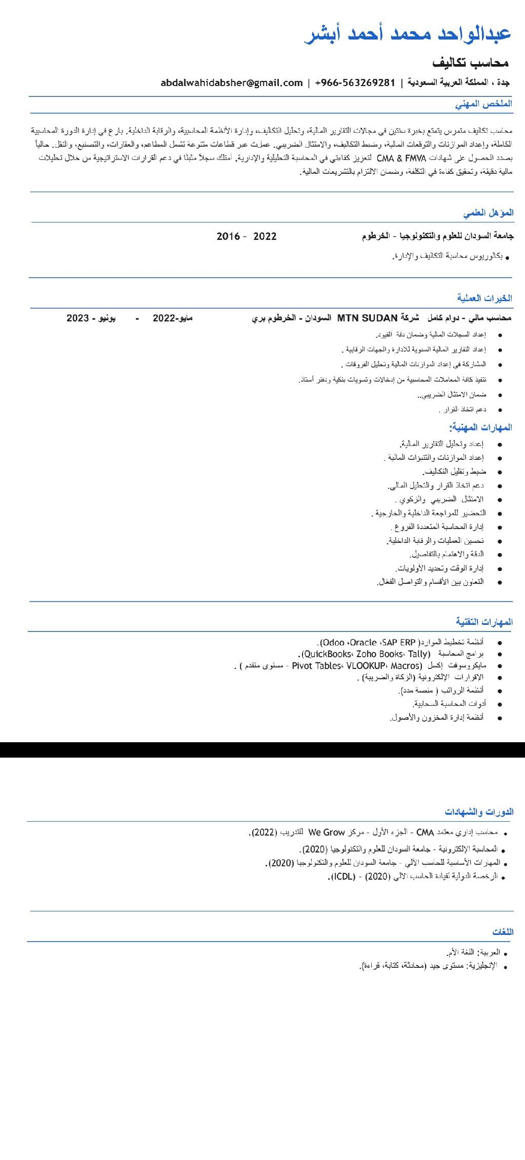 محاسب سوداني قادر على التحقق من فواتير الموردين وتجهيزها للدفع تسجيل فواتير المشتريات وتسجيل المصروفات التشغيلية ومطابقة كشف الحساب البنكي مع السجلات المحاسبية الداخلية المبيعات الاجلة والدفع لاحقا، واصدار فواتير للعملاء الاجلين وتحصيل الديون واعداد وتحليل التقارير المالية واعداد الموازنات والتنبؤات المالية الامتثال الضريبي والزكوي والمساهمة في اعداد التقارير خبير بنظم وماهر بمايكروسوفت أوفيس