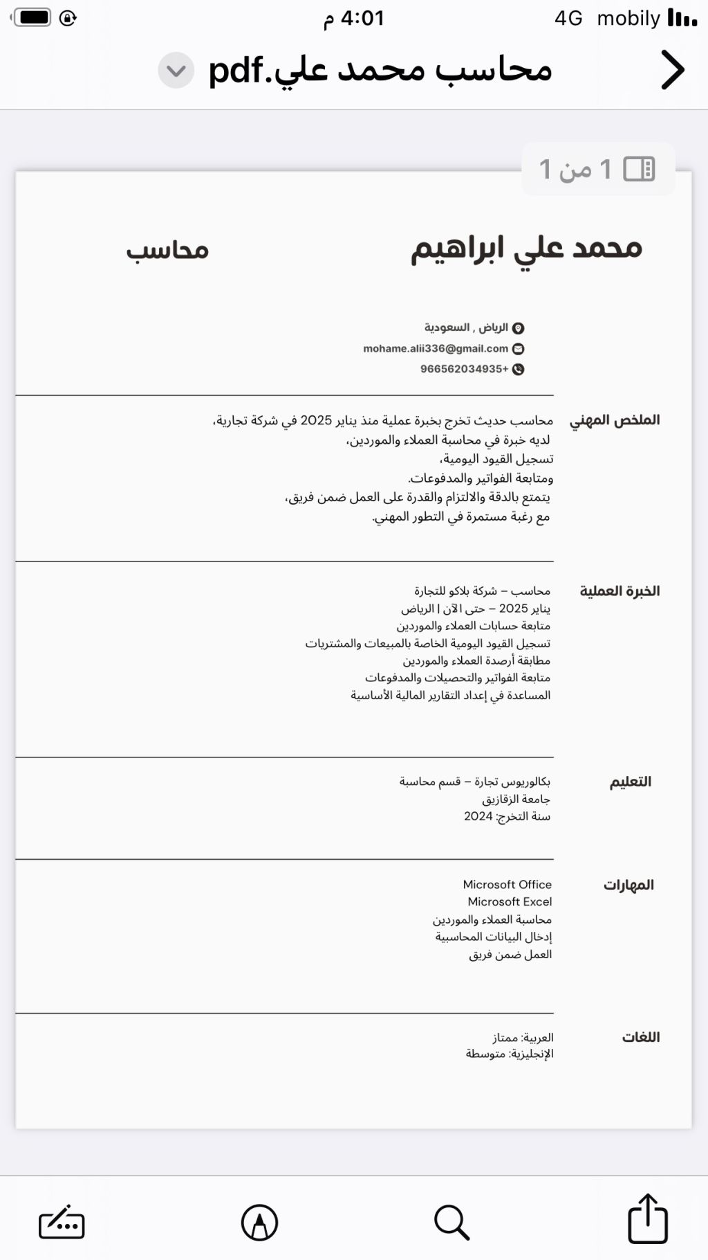 محاسب/ محمد علي من مصر 25 سنة حاصل علي بكالوريوس تجارة قسم محاسبه من جامعة الزقازيق متواجد في الرياض خبرة سنة في متابعة حسابات العملاء والموردين متابعة الفواتير والتحصيلات والمدفوعات المساعده في اعداد التقارير الماليه الأساسيه عمل القيود اليوميه والتسجيل في اليوميه الأمريكية والترحيل لدفتر الأستاذ وعملمين المراجعة بالا رصده