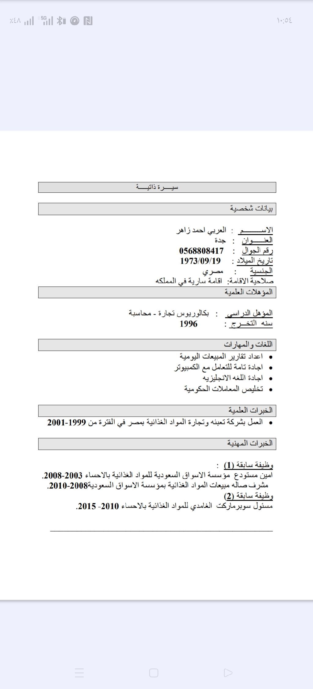 أنا مصري موجود في المملكة حاليا بطلب عمل حسابات أجيد اللغة الانجليزية وتخليص المعاملات الحكومية وتعامل تام على الكمبيوتر وتقارير المبيعات اليومية خبرة قديمة في مجال المحاسبة ثلاث سنوات وخمس سنوات أمين مستودع وخمس سنوات مسؤول ماركة الغامدى في الاحساء حاصل على بكالوريوس تجارة قسم محاسبة من سنة 1996 ميلادي