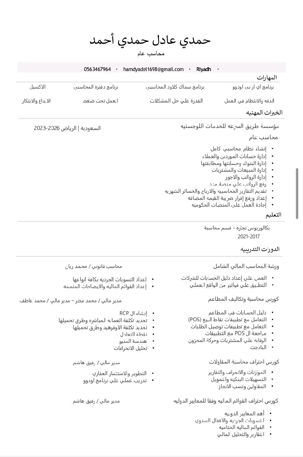 محاسب عام مصري خبرة 3 سنوات في السعودية، أجيد انشاء نظام محاسبي كامل والعمل علي برنامج ERP Odoo وبرنامج سماك كلاود وبرنامج دفتره، إدارة حسابات الموردين والعملاء، إدارة المشتريات والمبيعات، إدارة البنوك وحسابتها ومطابقتها، تقديم التقارير المحاسبية والأرباح والخسائر الشهريه، اعداد القوائم الماليه، اعداد ورفع اقرار ضريبة القيمة المضافة، اعداد ورفع الرواتب علي منصة مدد، اجادة العمل علي المنصات الحكوميه