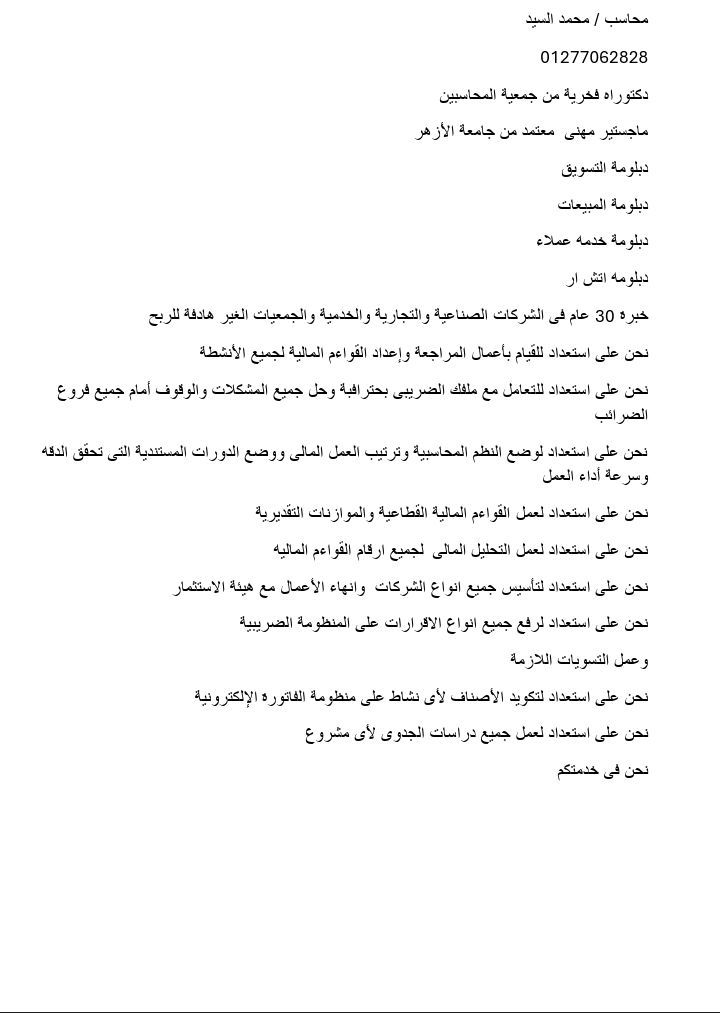 مدير مالي خبرة بجميع أنواع الضرائب والميزانيات. مسجل بسجل المحاسبين والمراجعين بوزارة المالية