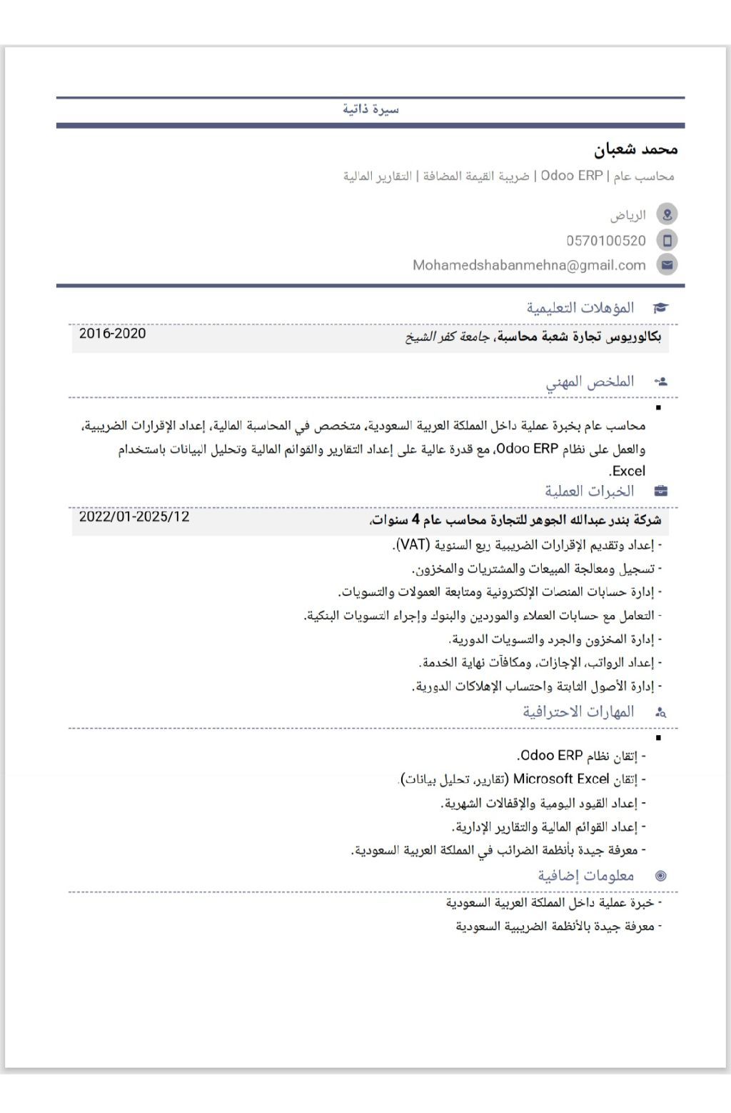 محاسب عام بخبرة تزيد عن 4 سنوات داخل السعودية اعداد تقارير مالية قيود يومية تسويات بنكية وتسويات جردية ضرائب واجادة Excel والأنظمة المحاسبية. Odoo ERP