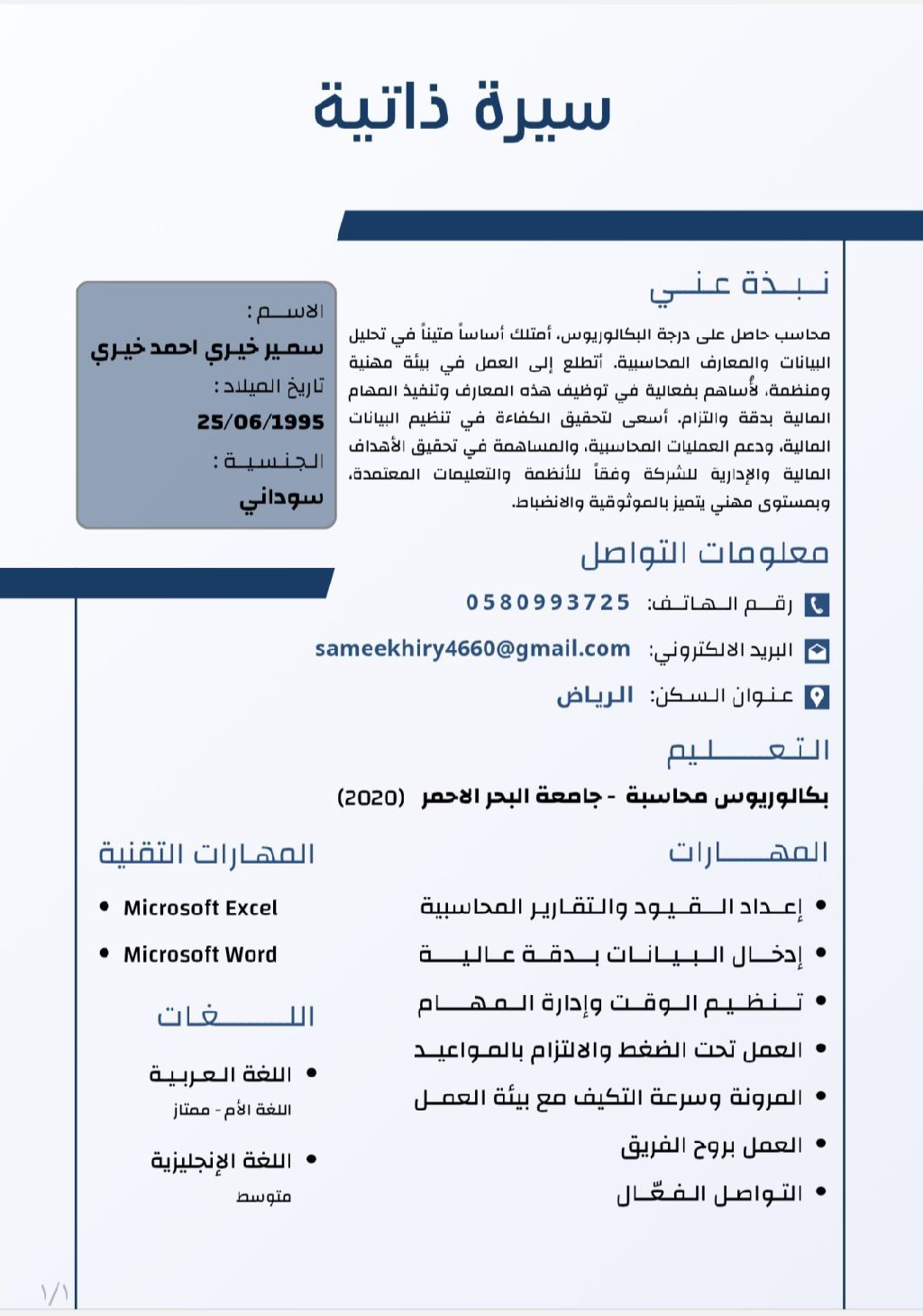 محاسب سوداني خبرة سنتين المهام ادخال القيود اليومية واعداد التقارير المحاسبية أتمتع بروح العمل والتعاون أتحمل ضغط العمل وإقامة عامل سارية الرياض