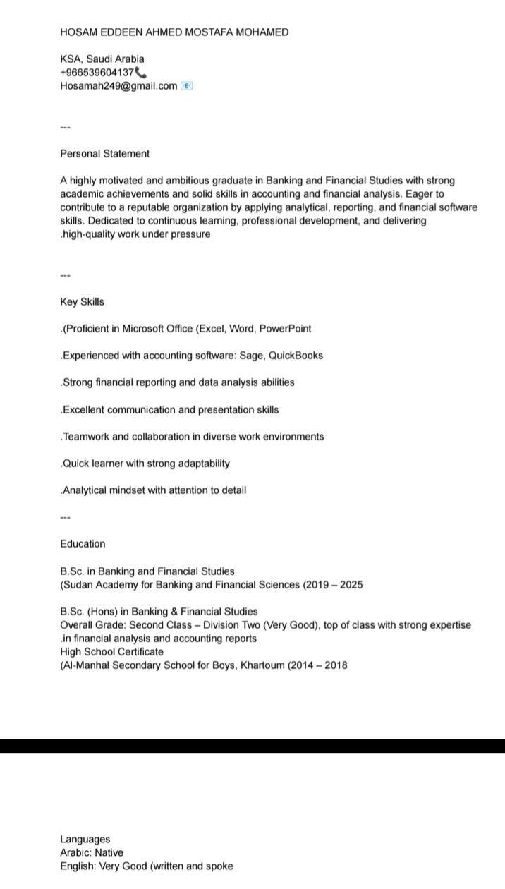 محاسب حديث تخرج - جاهز للعمل فورا محاسب حديث تخرج حاصل على بكالوريوس (شرف) في الدراسات المصرفية والمالية التقدير العام جيد جدا (Second Class - Division Two) لدي معرفة جيدة في المحاسبة المالية محاسبة التكاليف اعداد القيود اليومية الجرد والدورة المخزنية اعداد التقارير المالية أساسيات Excel وMS Office جاد ومنضبط في العمل سريع التعلم القدرة على العمل تحت الضغط الالتزام والدقة