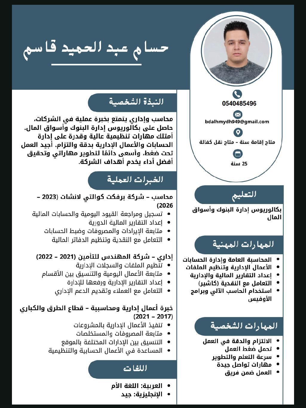 محاسب واداري يتمتع بخبرة عملية في الشركات متاح نقل كفالة