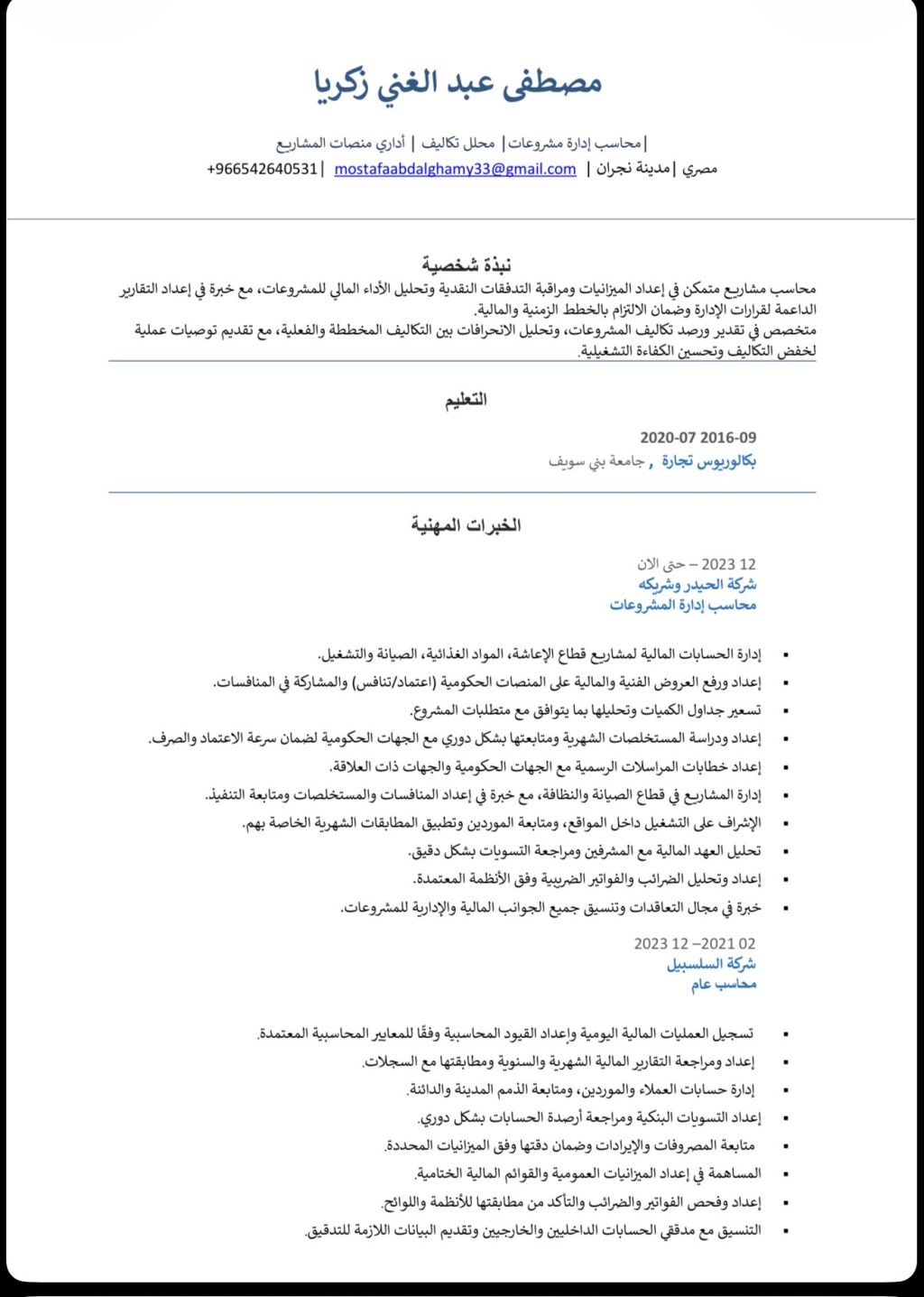 1 - أنا محاسب مشاريع خبرة 3 سنين في تنفيذ العروض الفنية والمالية وارفع علي المنصة خبرة فرز المنصة وجلب المشروع المناصب والعمل عليه بشكل كامل خبرة في تنفيذ المستخلصات الشهرية ومتابعاتها 2 - خبرة في تنفيذ مشاريع الصيانة والنظافة 3 - خبرة 3 سنين في ادارة التشغيل بشكل كامل 4 - خبرة في مطبقه الم ورادين والمشرفين 5 - خبرة في مراجعات العهد والفواتير الضربية ورفع الاقرار الضريبي
