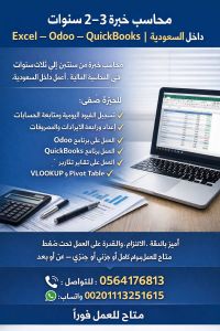 جاهز للعمل فورا محاسب خبرة 2 - 3 سنوات داخل المملكة العربية السعودية، لدي خبرة عملية في المحاسبة المالية واعداد التقارير. تسجيل القيود اليومية ومتابعة الحسابات اعداد التقارير المالية وتحليل البيانات العمل على Odoo وQuickbooks اعداد تقارير Excel احترافية (VLOOKUP - Pivot Table) تنظيم ومراجعة الايرادات والمصروفات بدقة أتميز بالدقة، الالتزام، وتحمل ضغط العمل. متاح للعمل بدوام كامل أو جزئي