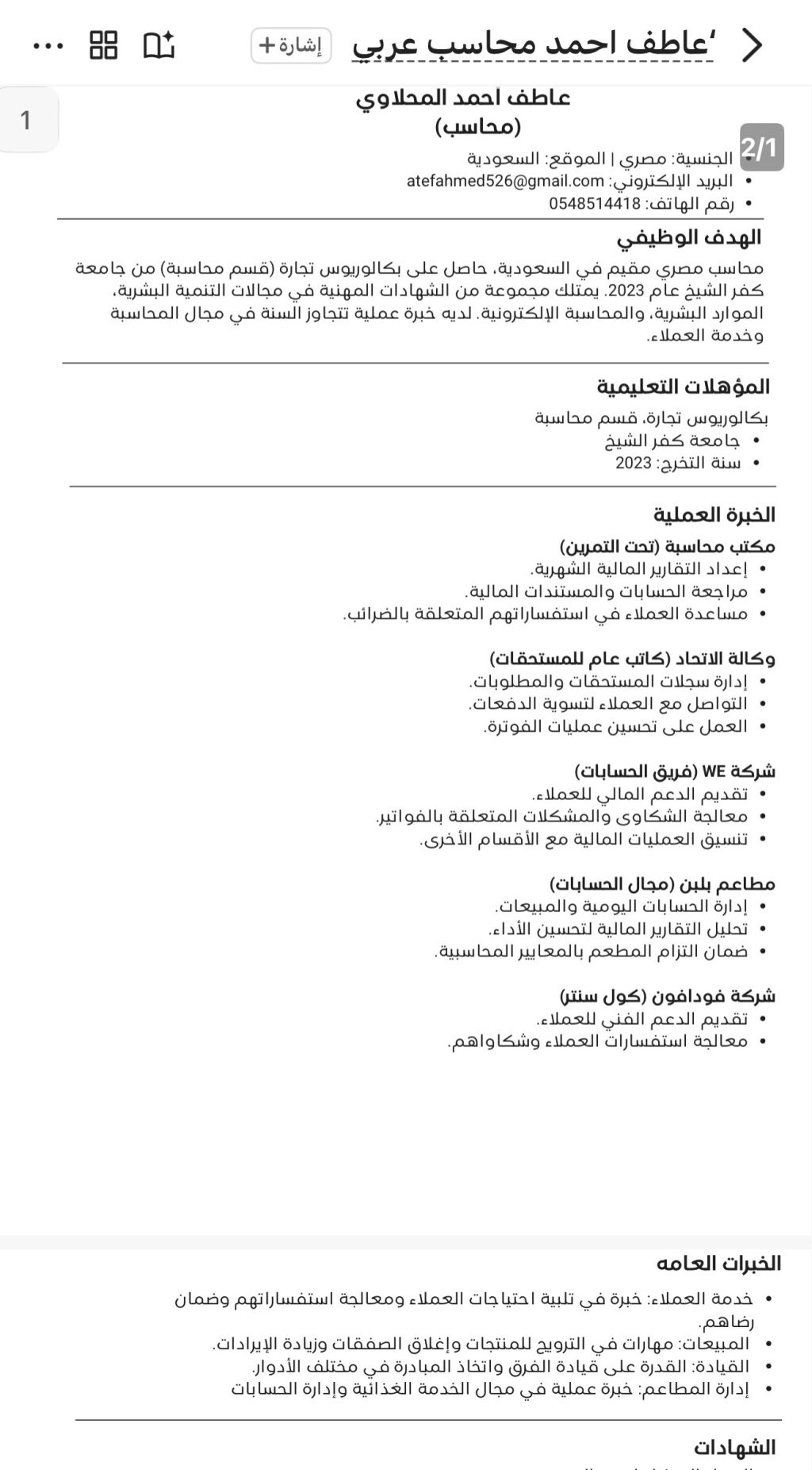 محاسب خبرة في جميع أعمال المحاسبة والضرائب اجادة تامة لبرامج المحاسبة وExcel اعداد القيود اليومية - التسويات البنكية - القوائم المالية متابعة العملاء والموردين اعداد وتقديم الاقرارات الضريبية القدرة على العمل تحت ضغط والالتزام بالمواعيد خبرة عملية في ضبط الحسابات وتقليل الأخطاء وتحسين الدورة المستندية. ملتزم بالدقة، السرعة، وسرية البيانات المالية