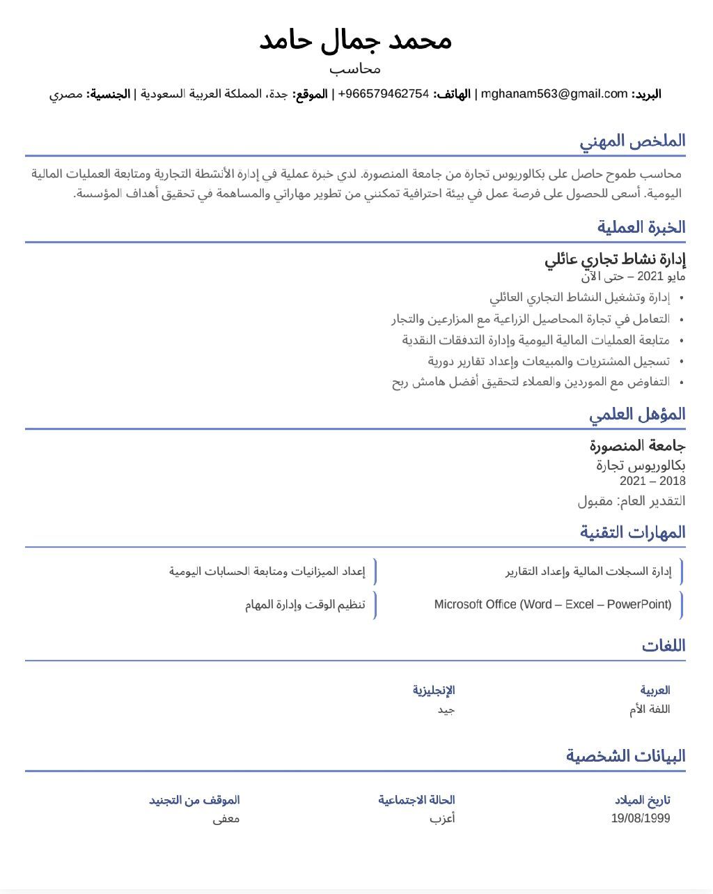 محاسب مصري 27 سنة مقيم في جدة حاصل على بكالوريوس تجارة شعبة محاسبة أجيد الدورة المستندية والدورة المحاسبية بالكامل وخبرة خاصة في ادارة الأنشطة التجارية وأجيد التعامل مع برامج مايكروسوفت أوفيس بشكل جيد جدا وحاصل على العديد من الكورسات ومستوى الانجليزي لدي جيد وجاهز للعمل الجاد في أي مكان داخل المملكة