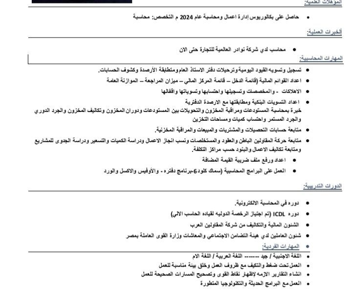 محاسب مالي عام مصري خبرة سنتين في مجال المحاسبة المالية للمؤسسات التجارية والصناعية والمطاعم والمقاولات خبرة باعداد القوائم الماليه والاقرارات الضريبية والمطابقات البنكية والعملاء والموردين والمقاولين والمستخلصات ودراسة الجدوى وخبرة بالبرامج المحاسبية سماك كلود ودفتره والأوفيس ولدي اقامة سارية وتسهيلات نقل كفالة