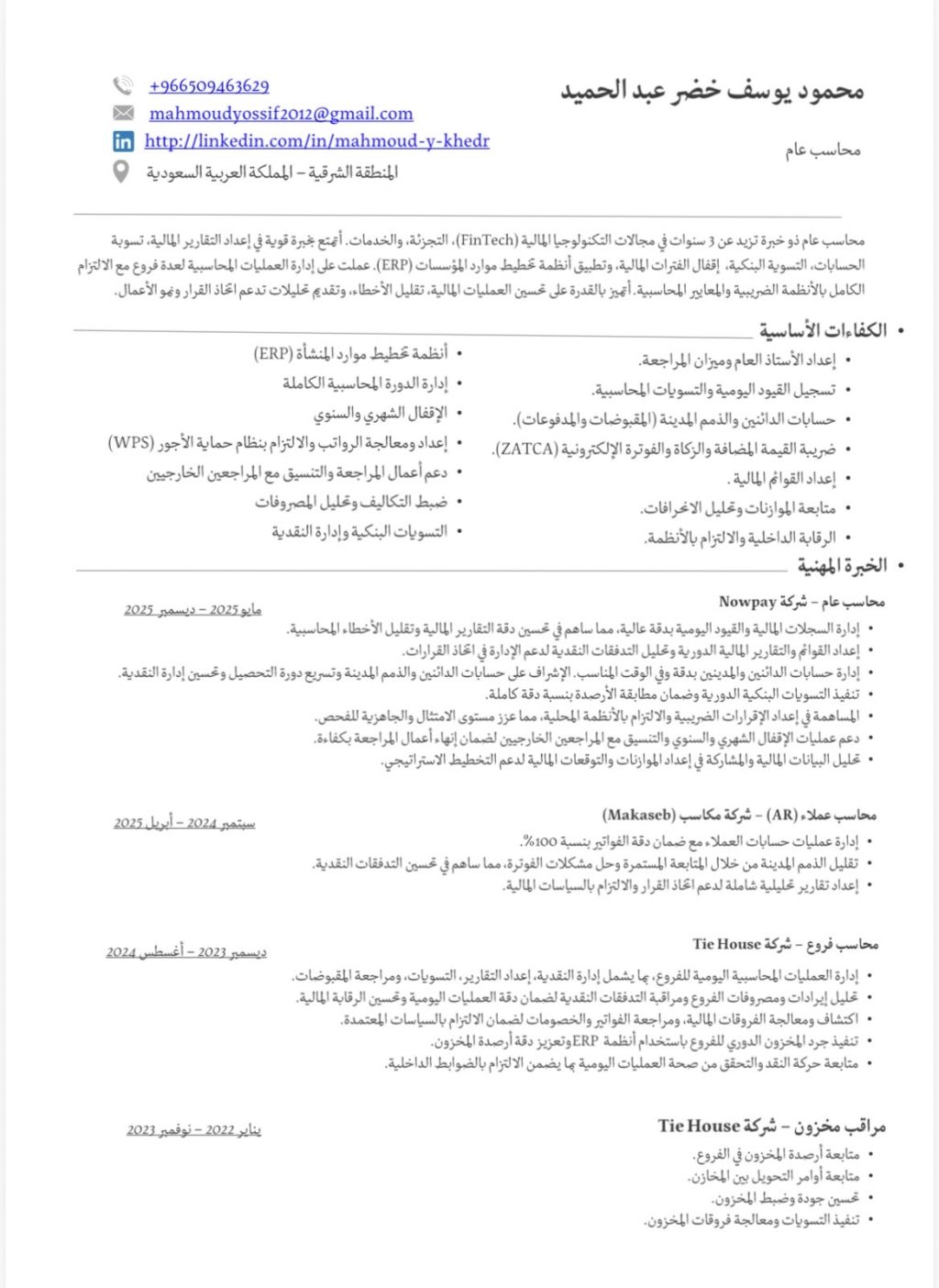 محاسب عام محترف، متخصص في حسابات العملاء والموردين (AR / AP) التسوية البنكية والأقفال الشهري والسنوي ضريبة القيمة المضافة وفاتورة ZATCA الالكترونية التقارير المالية وتحليل البيانات أنظمة ERP Oracle, Quickbooks, Zoho متواجد في المنطقة الشرقية ومستعد للبدء فورا