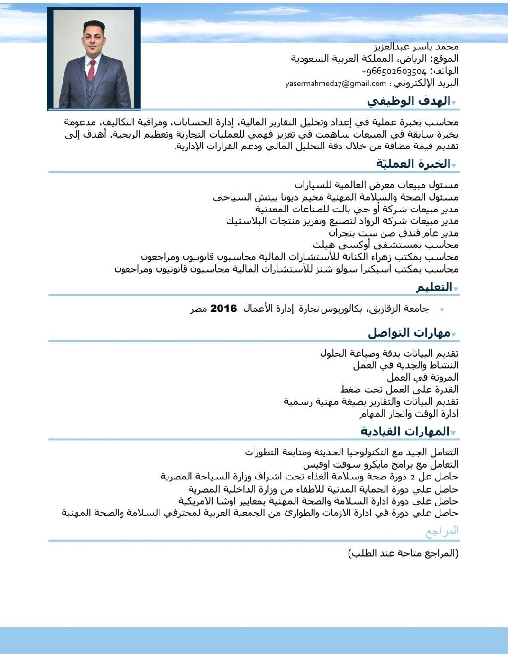 ابحث عن فرصة عمل بدوام كامل محاسب قانوني اعمل في مجال المراجعة والاستشارات المالية، لدي خبرة في فحص الحسابات، اعداد التقارير المالية، مراجعة العقود، والتأكد من الالتزام بالمعايير المحاسبية والضريبية. أتميز بالدقة العالية، القدرة على التحليل المالي، والعمل تحت ضغط، وأسعى لتطوير بيئة العمل ماليا ورقابيا بكفاءة واحترافية
