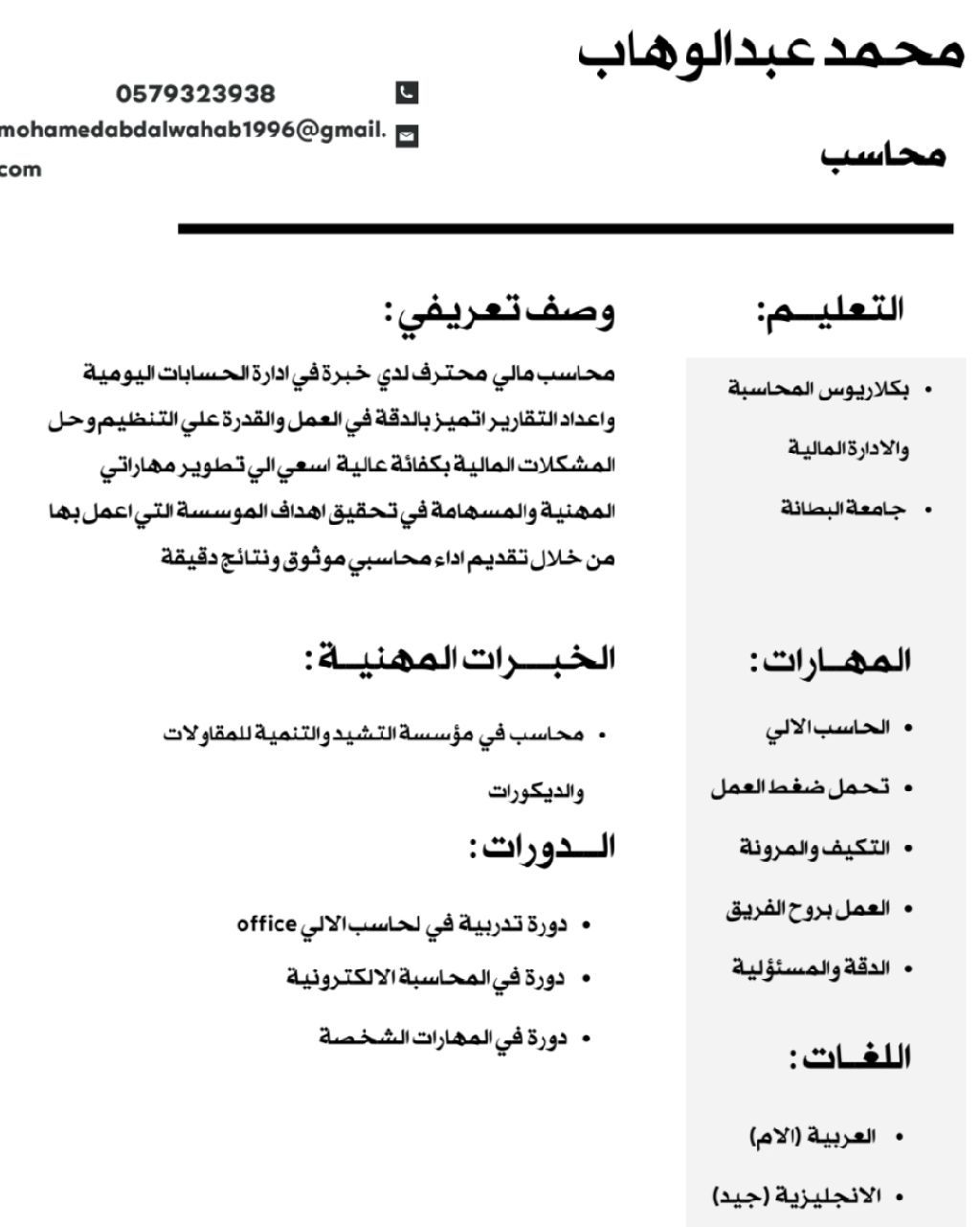 محاسب سوداني. أجيد التعامل مع البرامج المحاسبية ERB. بكالوريوس محاسبه وداره ماليه. خبرة أكثر من سنة في مجال الحسابات اليوميه واعداد التقارير المالية
