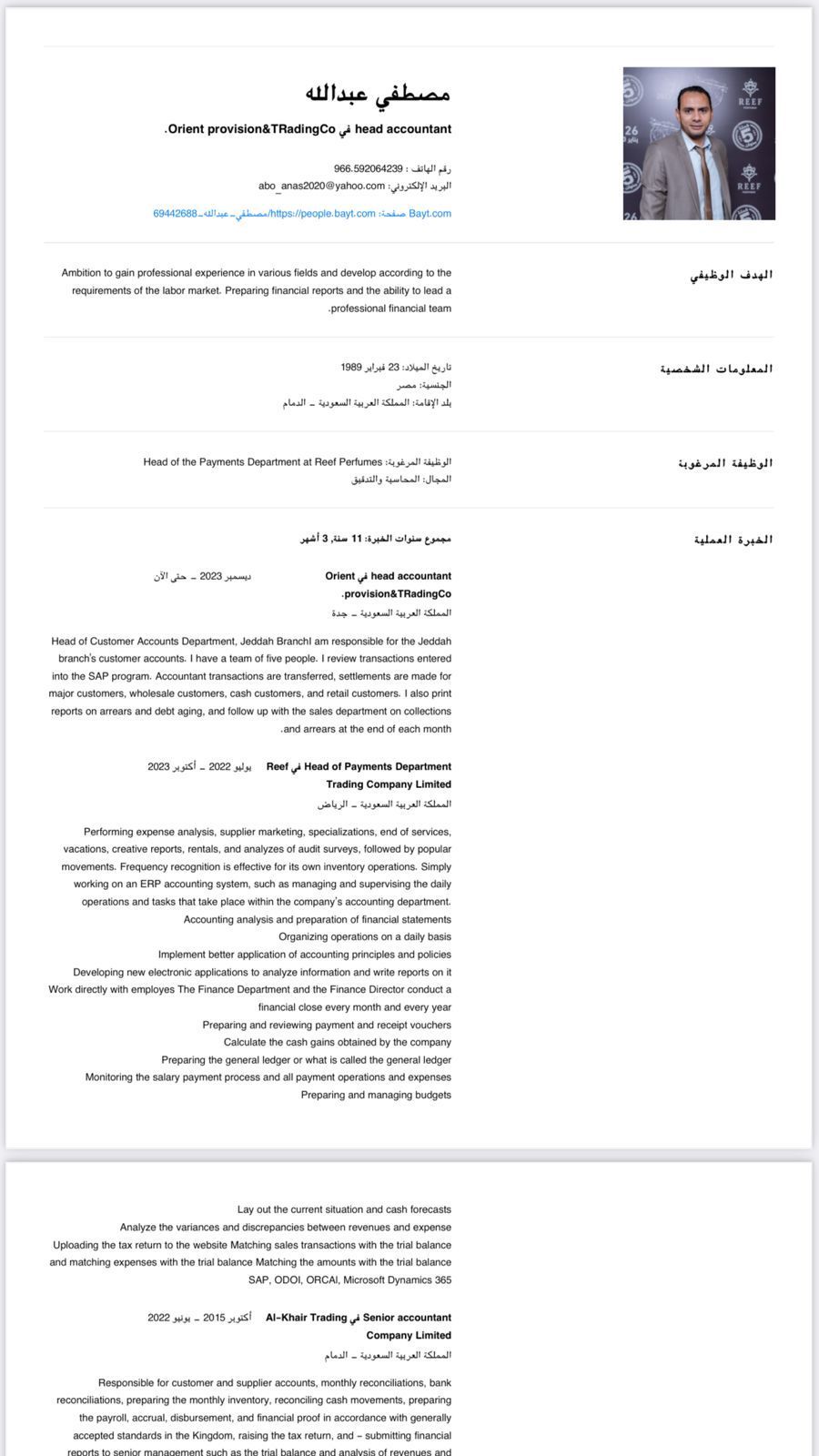 محاسب أول حسابات عملاء وموردين اشتغلت في شركة الماجد للعود وشركة تموين الشرق فرشلي واشتغلت علي برامج ERP مثل الساب ودينمك 365 ابحث عن فرصة عمل