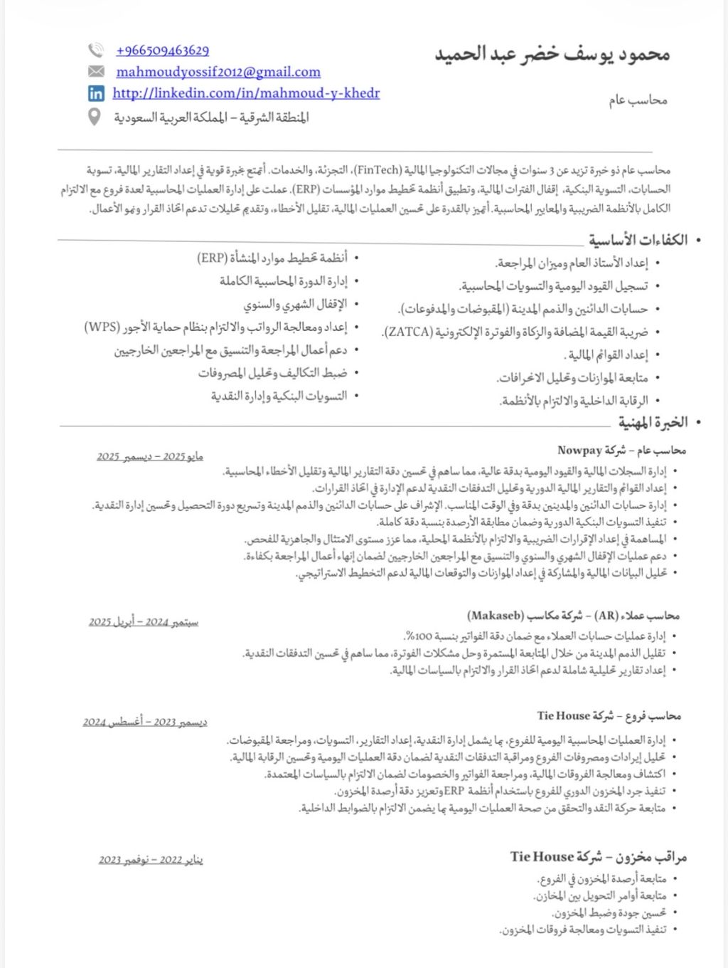 محاسب مصري الجنسية بخبرة عملية لمدة 4 سنوات في شركات التجزئة، الخدمات، الرفاهية المالية، مع المام كامل بالاجراءات المالية والمحاسبية، واعداد القيود اليومية، والتقارير المالية، والتسويات البنكية، ومتابعة العملاء والموردين. متواجد حاليا في المنطقة الشرقية على مؤسسة فردية متاح نقل كفالة