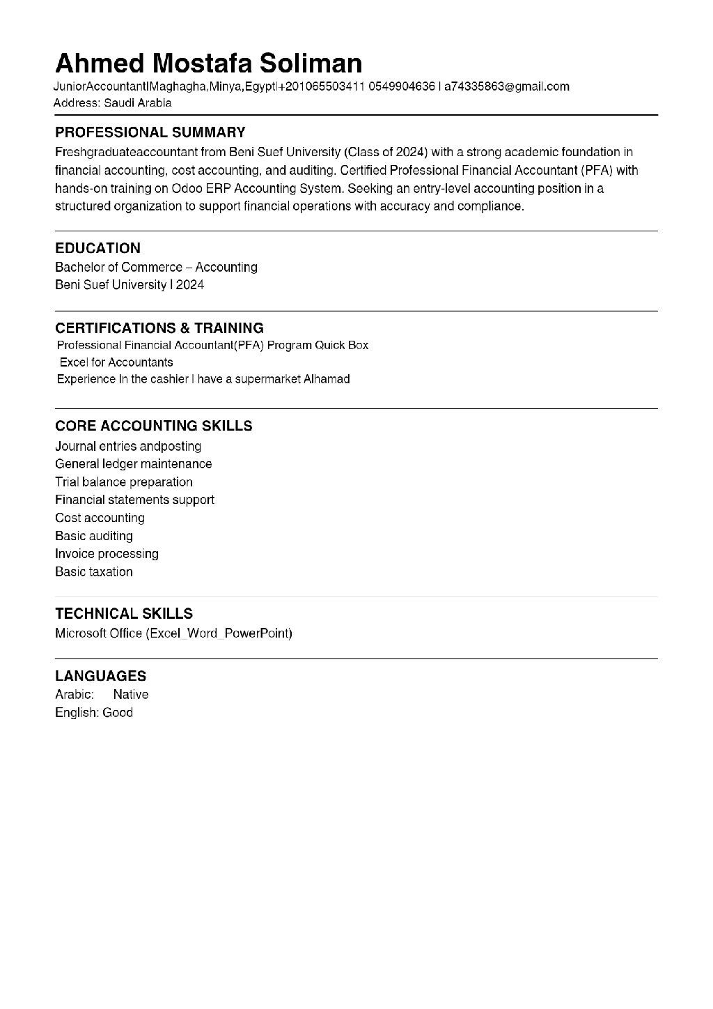محاسب حديث التخرج يجيد الأعمال المحاسبية وجميع برامج مايكروسوفت أوفيس بدقة عالية