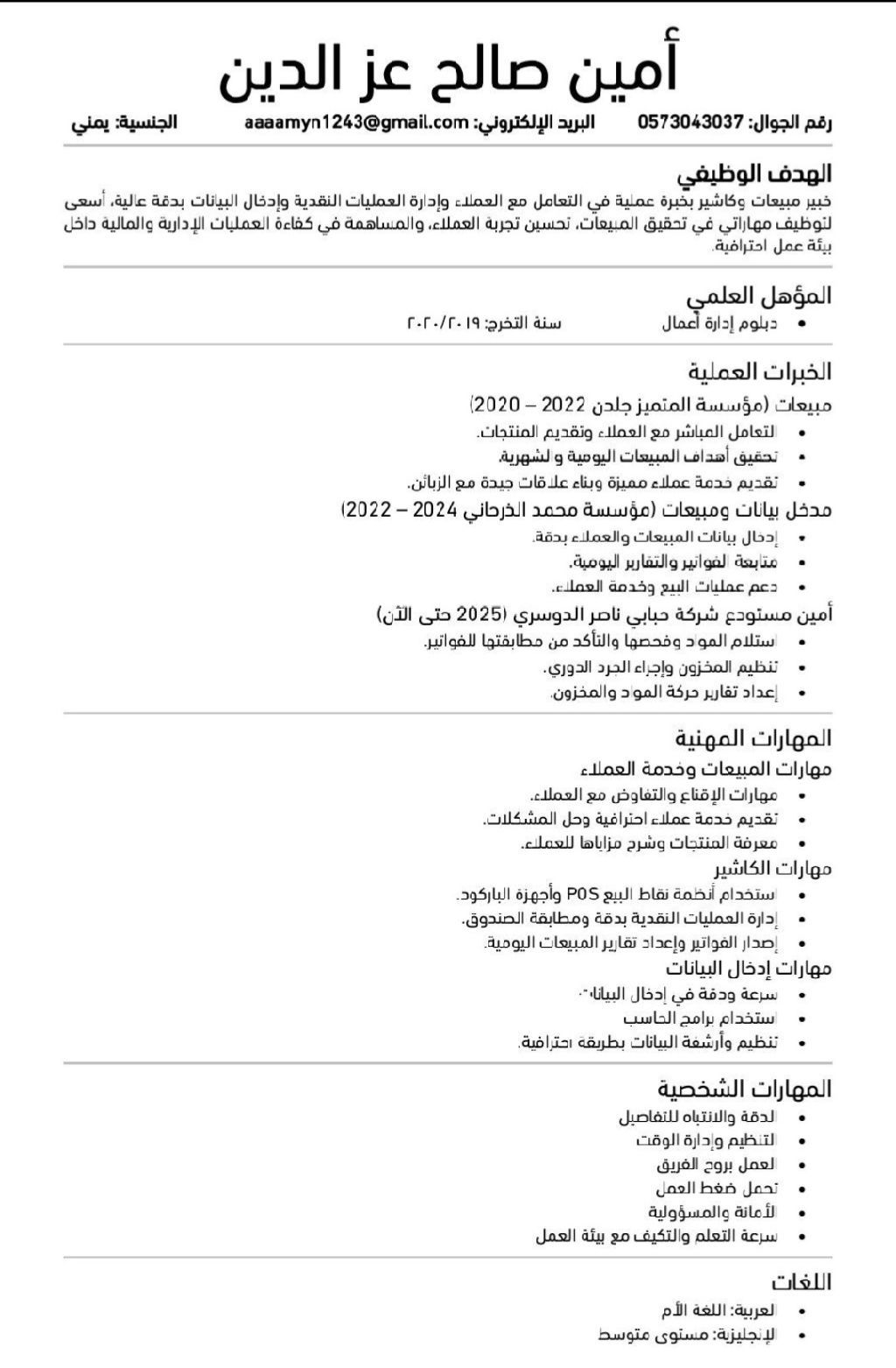 يمني ابحث عن فرصة عمل كاشير أو مبيعات أو مدخل بيانات أو أمين مستودع خبرة وكفاءة 5 سنوات موظف متعدد المهام يتمتع بخبرة عملية في خدمة العملاء والتعامل المباشر مع الجمهور، مع مهارة فائقة في ادخال البيانات والتدقيق الحسابي. أجمع بين اللباقة في المبيعات، والدقة في إدارة الكاشير، والسرعة في استخدام الأنظمة الالكترونية وادخال البيانات. ملتزم بتحقيق أهداف المنشأة وضمان رضا العملاء التام