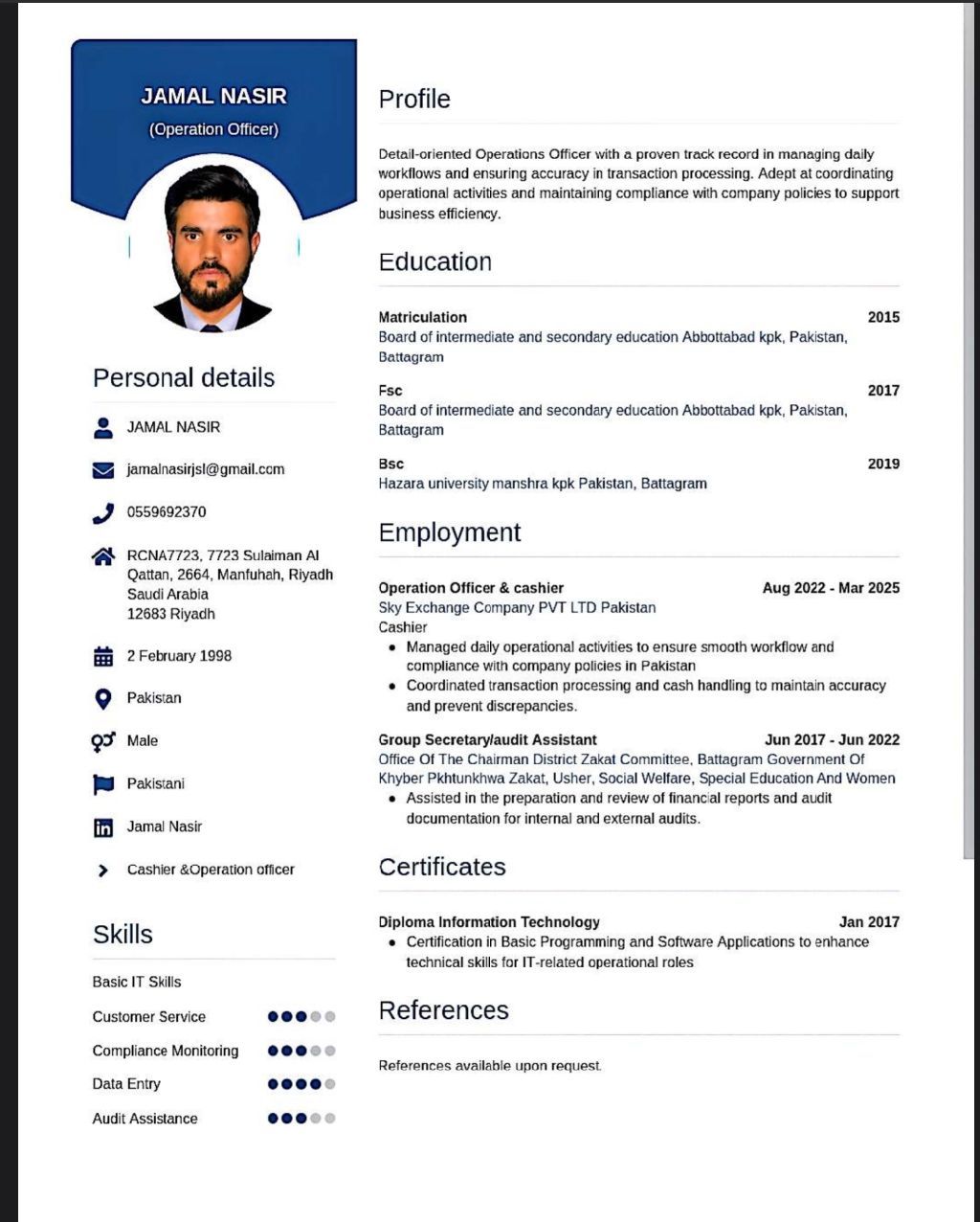 Dear Hiring Manager, I hope you are doing well. I am writing to apply for a suitable position in your organization, preferably in Cashier, Accounts, or Operations roles. Experience in Exchange Company I have 3 years of experience at Sky Exchange Company (PVT) LTD, Pakistan, where I worked as a Cashier and later as an Operation Officer. During this time, I gained strong expertise in Cash