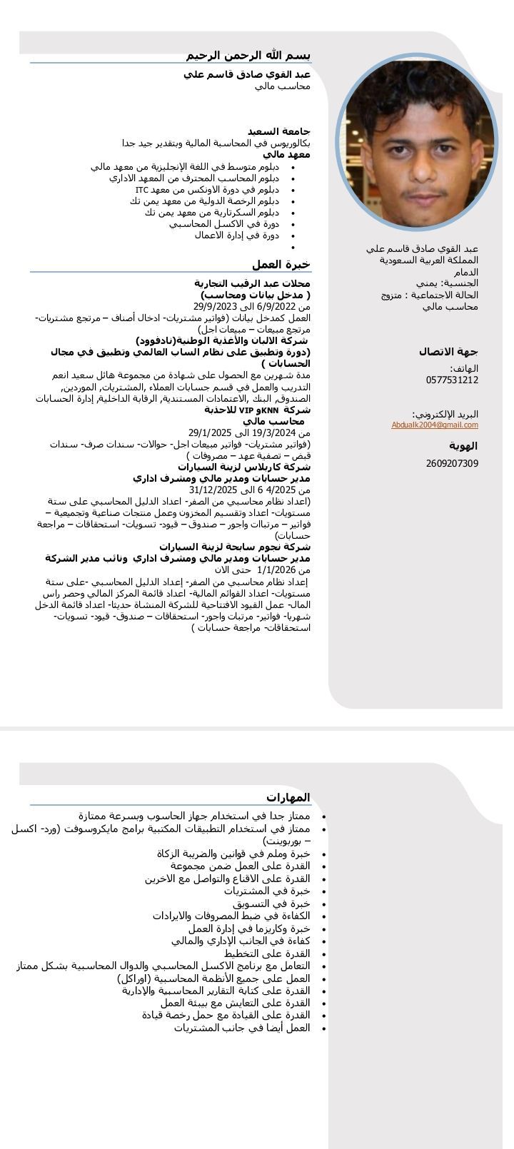 مدير حسابات ومحاسب مالي خبرة لا تقل عن 4 سنوات خبرة في اعداد الأنظمة المحاسبية وتقسيم المخزون واعداد الدليل المحاسبي علي ستة مستويات واعداد التقارير اليومية والشهرية وأقفال كل شهر بايراداته ومصروفاتة وصدار القوائم المالية (قائمة الدخل ومعرفة نتيجة النشاط ربح أو خسارة - قائمة المركز المالي ومعرفة رأس المال للشركة) قيود يومية تسويات استحقاقات مرتبات وأجور خبرة ادارية. خبرة في الضريبة