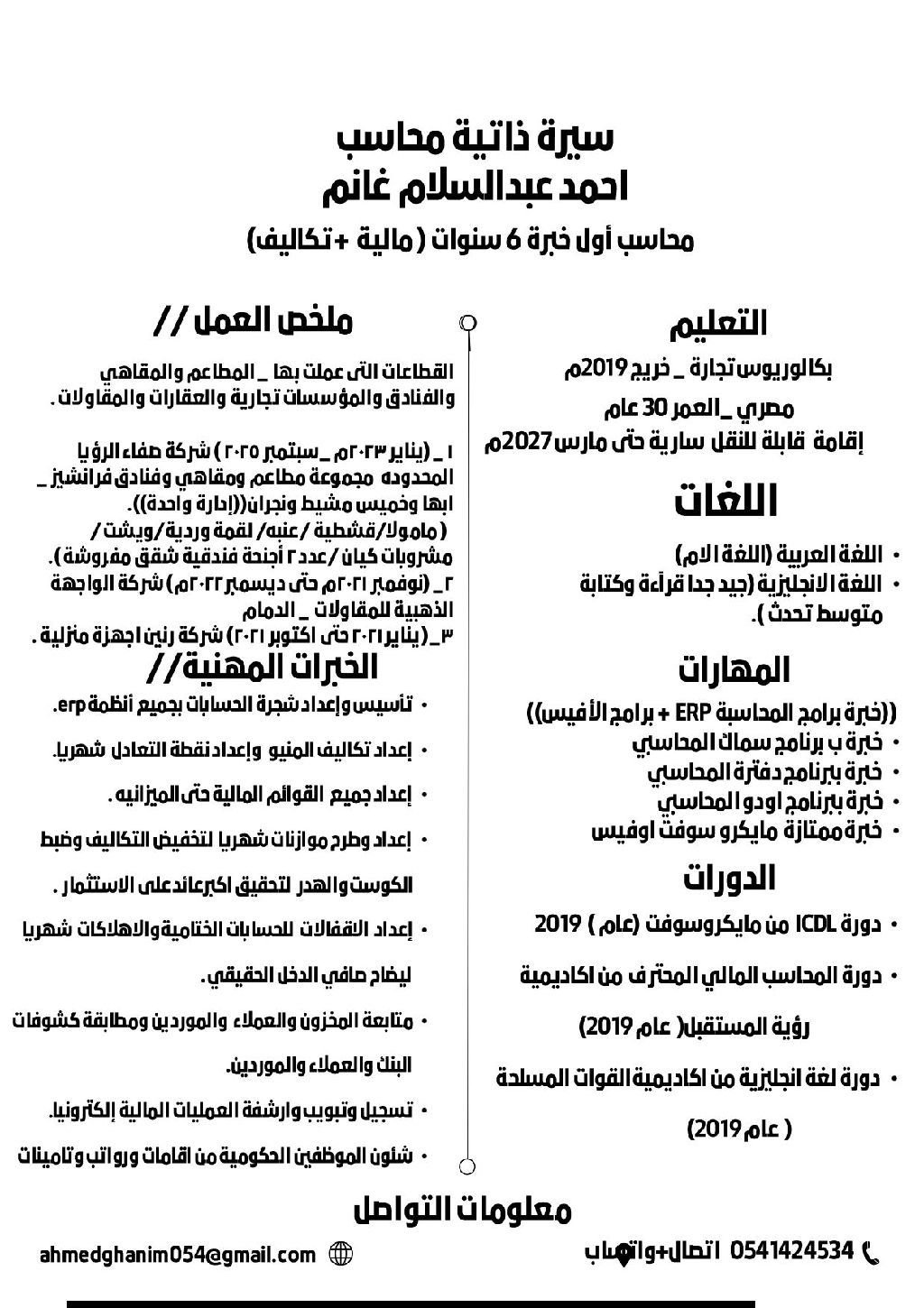 محاسب أول / رئيس حسابات خبرة 6 سنوات (مالية + تكاليف) في التحليل المالي واعداد القوائم المالية وإدارة التكاليف، امتلك سجل حافل في تقديم رؤى مالية استراتيجية، وإدارة حسابات دقيقة، وتحسين كفاءة العمليات المالي إقامة سارية حتى 2027م رخصة قيادة