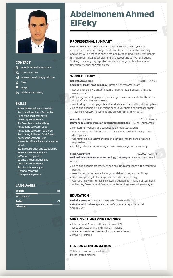 محاسب مصري مقيم في الرياض لدى خبرة أكثر من خمس سنوات أجيد عمل التقاربر الماليه وحسابات العملاء والموردين ومراقبة حركة المخزون وعمل التسويات الجردية والاقرارات الضربية ورفع الاقرار الضريبي ولدى خبرة في مجال المواد الغذائية والاتصالات ونشاط شركات السيارات للتواصل