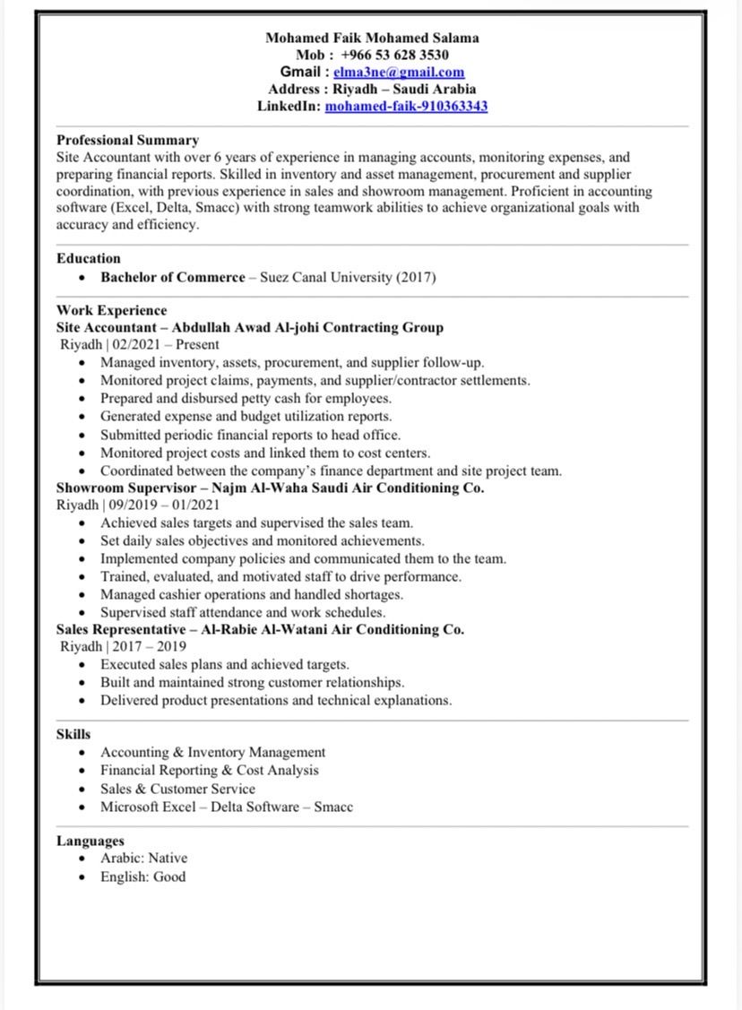 محاسب موقع مصري خبرة 5 سنوات بالمشاريع اعمل على ادارة العهد النقديه وتسويتها بشكل دوري مع ارفاق المرفقات لاثبات صحة المصروف بالتنسيق مع مدير المشروع والتوجيه الدقيق على مراكز التكلفة - متابعه احتياجات الموقع من مواد ودفعات للمقاولين والموردين وذلك بالتنسيق مع الادارة الماليه - المتابعة مع الموردين ومطلبقه كشوفات الحساب - اعداد أي تقارير مالية قد تطلبها الادارة خبرة بالاكسل والبرامج المحاسبية
