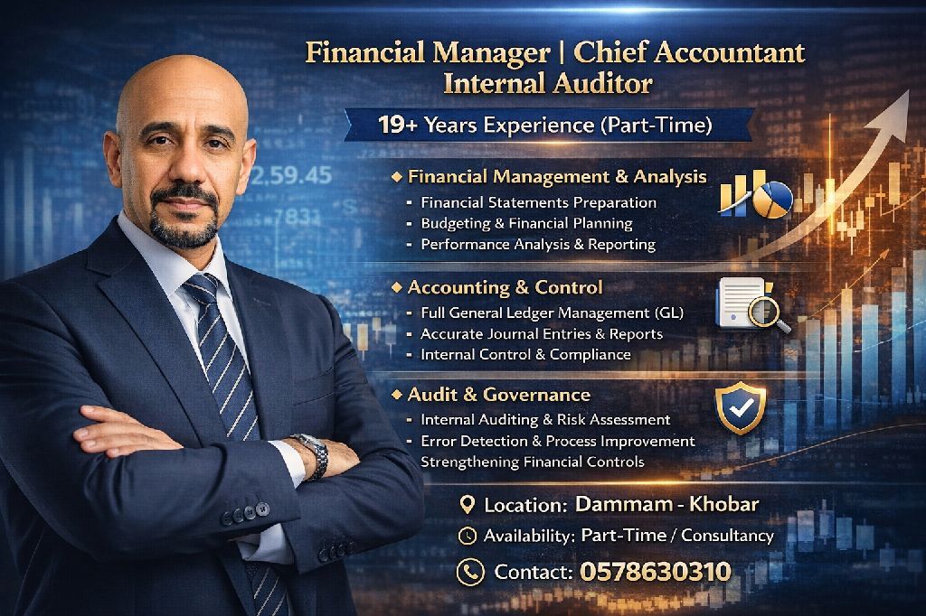 مدير مالي رئيس حسابات مراجع داخلي - خبرة 19 + سنة (دوام جزئي) هل تبحث عن خبرة مالية قوية تدعم نمو أعمالك وتضبط حساباتك باحتراف أنا محترف مالي بخبرة تتجاوز 19 عاما في الإدارة المالية المتقدمة اعداد القوائم المالية والتقارير للإدارة العليا اعداد الميزانيات والتخطيط المالي تحليل الأداء المالي واتخاذ القرار المحاسبة والرقابة إدارة الحسابات العامة (GL) بالكامل
