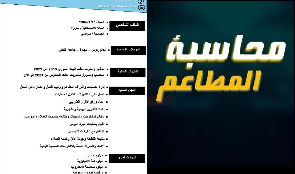 محاسب كاشير ومشرف مطاعم سوداني الجنسية - مؤهل جامعي - خبرة في مجال المطاعم - أجيد العمل علي الكاشيرات وتقفيل الحسابات - إدارة حسابات واشراف المطاعم - اعداد ورفع الاقرار الضريبي - اعداد التقارير اليومية والشهرية - التعامل مع تطبيقات التوصيل - إدارة المشتريات ومتابعة حسابات العملاء والموردين - القيام بعمليات الجرد اليومي - المعرفة التامة بالاشتراطات الصحية للبلدية - متوفر رخصة قيادة - ابحث عن عمل