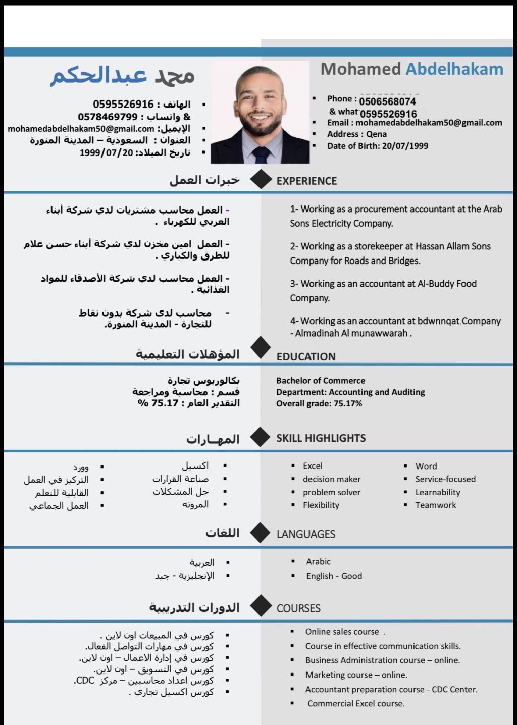 محاسب مصري مقيم في مدينة المنورة خريج كلية تجارة قسم محاسبة ومراجعة خبرة سنتين في الحسابات في المملكة العربية السعودية خبرة في متابعة أرصدة العملاء والموردين وادره حساب الخزنة والبنك واعداد شيتات بها خبرة في برامج مايكروسوفت أوفيس وخبرة في برامج والأنظمة المحاسبية والعمل علي برنامج المحاسبي أونكس برو لمدة سنتين جهاز لنقل الكفالة
