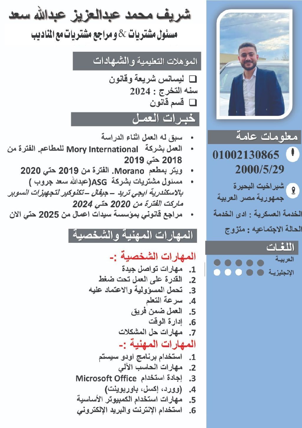 أنا شريف مصري واعمل مسؤول مشتريات ومراجع مشتريات مع المناديب. وابحث عن عمل داخل المملكة. وأنا حاليا متواجد في مصر