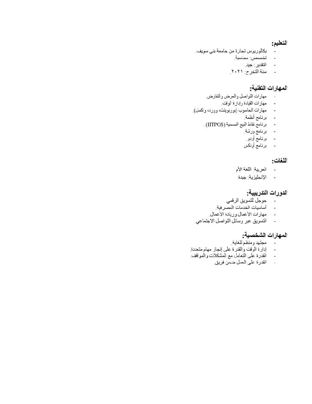 محاسب حاصل على بكالوريوس تجارة تخصص محاسبة، لدي خبرة عملية في إدارة العمليات المالية تشمل الفواتير، الحسابات المدينة والدائنة، واعداد التقارير المالية. امتلك مهارات قوية في استخدام الأنظمة المحاسبية مثل Excel وOdoo، مع قدرة على التحليل المالي والعمل تحت الضغط. أسعى للانضمام الى مؤسسة احترافية لتحقيق قيمة مضافة وتطوير الأداء المالي