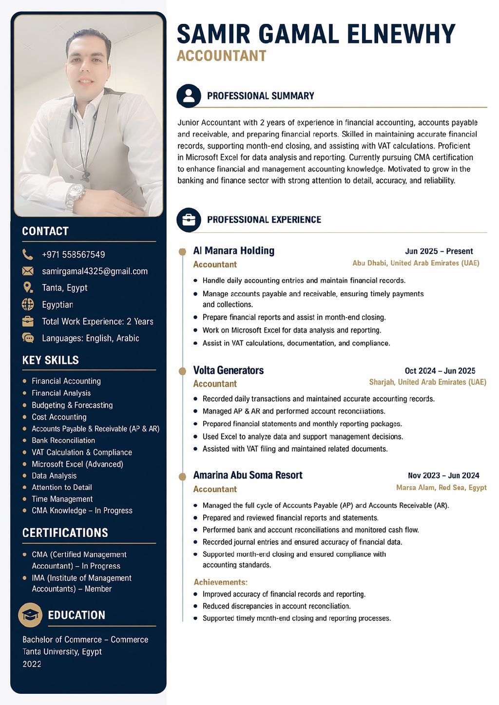Junior Accountant with 2 + years of experience in financial accounting, AP & AR, and financial reporting. Skilled in Excel and data analysis. Currently in Abu Dhabi and available to join immediately. Seeking opportunity in banking or finance sector