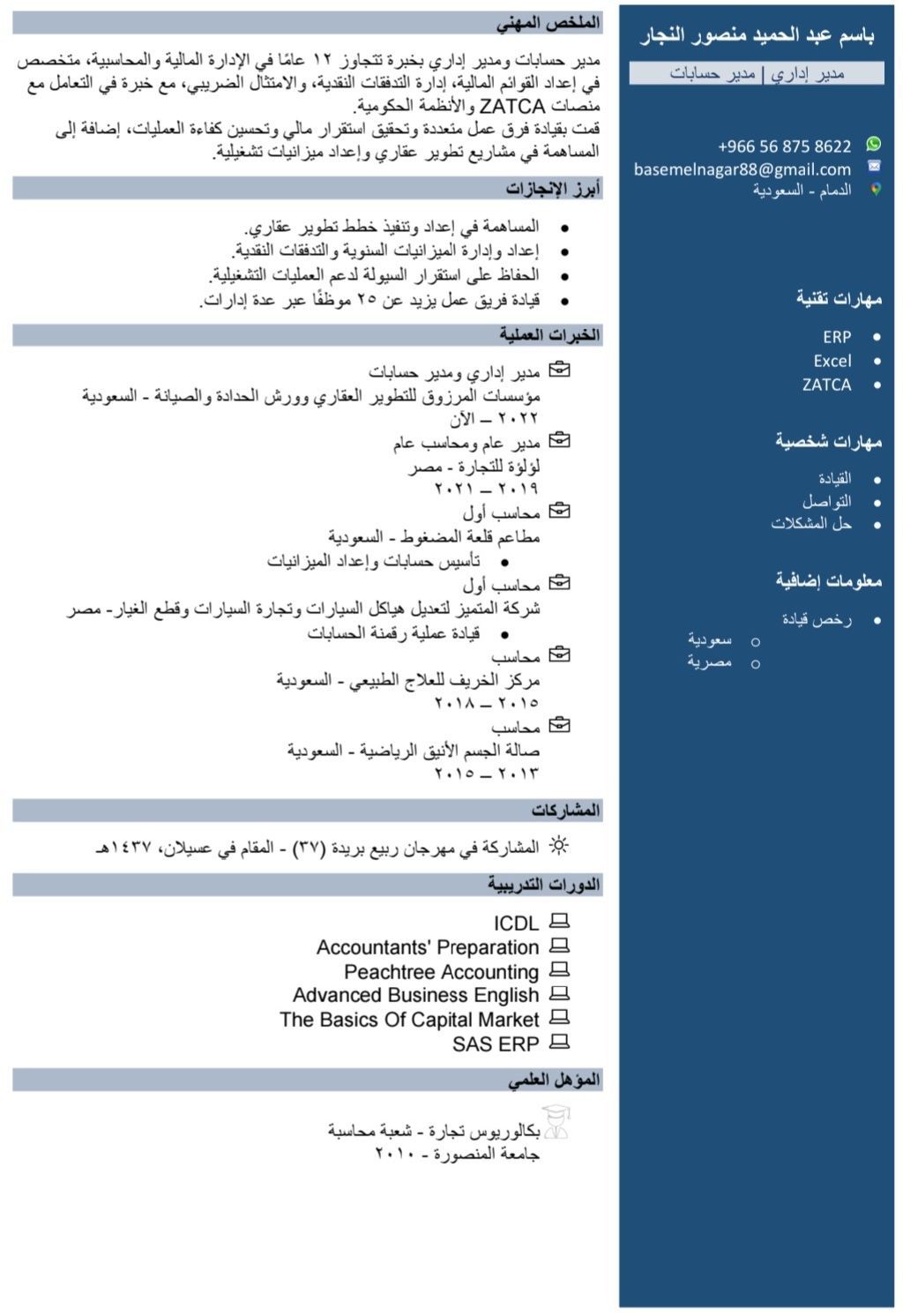 مدير حسابات ومدير اداري بخبرة تتجاوز 12 ع أم أف يا لإدارة المالية والمحاسبية، متخصص في اعداد القوائم المالية، إدارة التدفقات النقدية، والامتثال الضريبي، مع خبرة في التعامل مع منصات ZATCA واألنظمة الحكومية. قمت بقيادة فرق عمل متعددة وتحقيق استقرار مالي وتحسين كفاءة العمليات، اضافة الى المساهمة في مشاريع تطوير عقاري واعداد ميزانيات تشغيلية