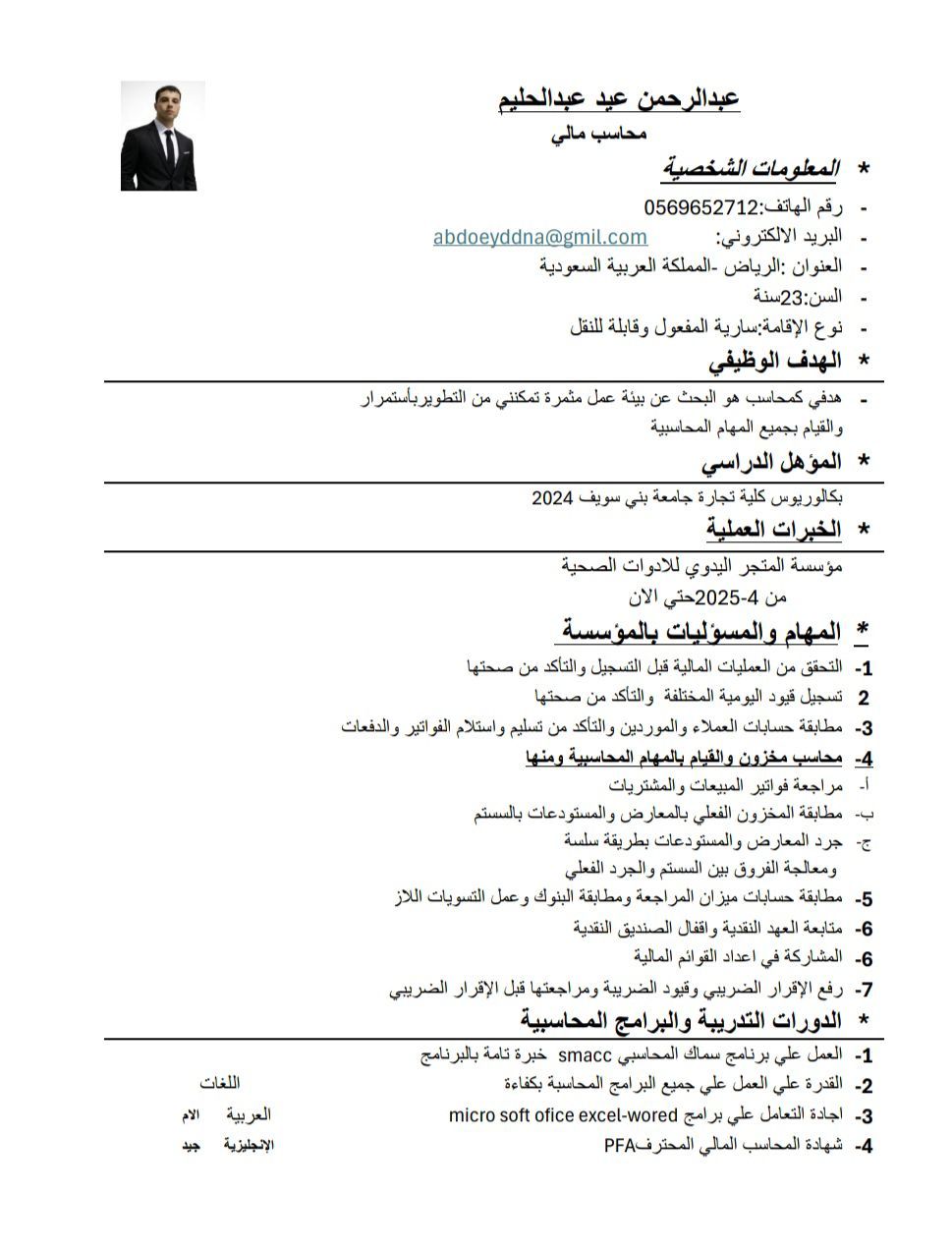 محاسب خبرة سنتين داخل المملكة والقدرة علي القيام بجميع المهام المحاسبية