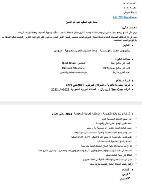 يطلب عمل حسابات في منطقة عسير السعودية