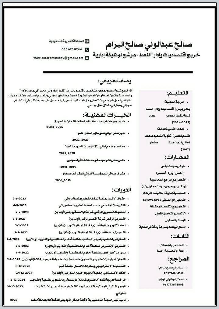 أنا خريج كلية النفط والمعادن - جامعة عدن، تخصص اقتصاديات وإدارة النفط، ولدي خبرة عملية لمدة 3 سنوات في مجالات الإدارة والمحاسبة والكاشير. ابحث عن فرصة عمل مناسبة في مجال الإدارة، المحاسبة، المالية، أو أي مجال يتوافق مع خبرتي وتخصصي. أتميز بالالتزام، والدقة، والقدرة على العمل ضمن فريق، وسرعة التعلم