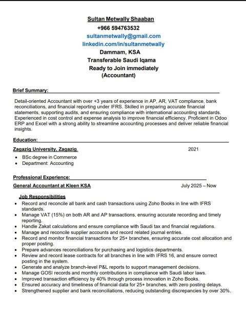 محاسب عام بخبرة عملية تفوق + 3 سنوات في حسابات العملاء والموردين (AP / AR) التسويات البنكية، اعداد ضريبة القيمة المضافة والاقرارات، والتقارير المالية وفق معايير IFRS. خبرة قوية في أنظمة ERP وخاصة Odoo وDaynamic 365 وZoho اجادة Excel لاعداد الجداول والتقارير المالية الدقيقة بكالوريوس محاسبة - إقامة قابلة للنقل (Transferable Iqama) ابحث عن فرصة عمل مناسبة في الشرقية - الرياض - جدة جاهز للانضمام فورا