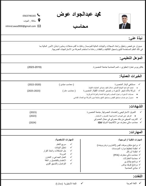 محاسب مصري ذو خبرة عملية لمدة سنة في مجال المحاسبة، وعمل على مسك الحسابات اليومية والشهرية والسنوية ومراقبة المخزون والعملاء والموردين أجيد التعامل مع البرامج المحاسبية المختلفة، بالاضافة الى مهارة متقدمة في استخدام حزمة Microsoft office، أجيد التعامل مع المنصات الحكومية المختلفة، لدي خبرة قانونية وادارية في تنظيم عمل المؤسسة أتمتع بالدقة والتنظيم والقدرة على العمل ضمن فريق وتحمل ضغط العمل