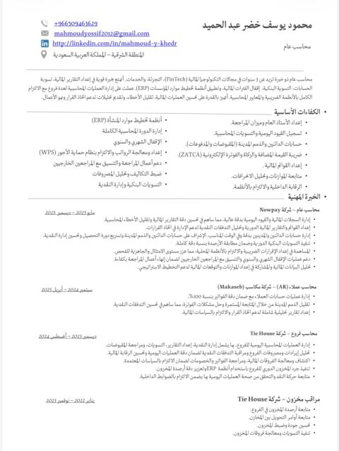 محاسب عام خبرة في اعداد دليل الحسابات ومتابعة العملاء والموردين وعهد الموظفين والسلف ومطابقة الخزينة والبنوك بشكل يومي ومتابعة المخازن والتسوية الجردية والحسابات الختامية والتقارير الضريبة ومطابقتها مع ميزان المراجعة سواء على سيستم أو أكسيل. خبرة في تقديم القوائم المالية من قائمة الدخل والمركز المالي للشركة. خبرة تسعة سنوات داخل المملكة