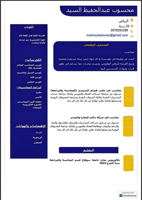 محاسب واداري سوداني خبرة 28 سنة عملت محاسب ثم رئيس حسابات. الخبرات في السعودية سنتين مستشفى اسطون في الدمام عملت بمؤسسة أسجاف للمقاولات 18 سنة ثم شركة اللؤلؤ الساطع للتجارة والاستيراد مواد غذائية. ثم شركة لمياء الخير للمقاولات في المدينة المنورة. وتعاملت مع العديد من مكاتب مراجعة الحسابات لدي خبرة كبيرة بكافة الحسابات من ادارة النقدية والأصول والموردين والعملاء والتسويات البنكية واصدار الميزانيات