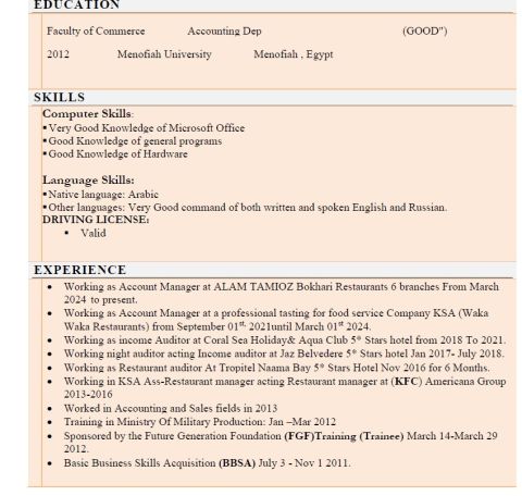 محاسب خبرة أكثر من 10 سنوات في مجال المطاعم والفنادق. مدير ايرادات فنادق ومحاسب عام مطاعم. تقليل التكاليف والحصول علي أفضل عروض أسعار ولدي داتا لشركات كبيرة تم التعامل معها من قبل. وكذلك مسؤول علي الامور التي تخص العاملين من تجديد اقامات ورخص عمل حيث انني شغلت وظيفة مدير مطعم كنتاكي 5 سنوات في الرياض وكذلك لدي المهارة في التعامل مع الموردين والحصول علي أفضل جودة وأقل سعر. حاليا اعمل كمحاسب بمطاعم