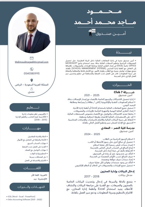 محاسب مالي حديث التخرج مصري الجنسية امتلك أساسا جيدا في المحاسبة المالية وبعض الخبرات العملية وأتميز بالدقة والتنظيم والقدرة على التعلم السريع ولدي معرفة جيده بالبرامج المحاسبية وبرامج الأوفيس وخاصة الأكسيل وأنظمة ERP أسعى للحصول على فرصة عمل في بيئة احترافية لتطوير خبراتي والمساهمة في تحقيق أهداف المنشأة ومتاح لنقل الكفالة أول مرة