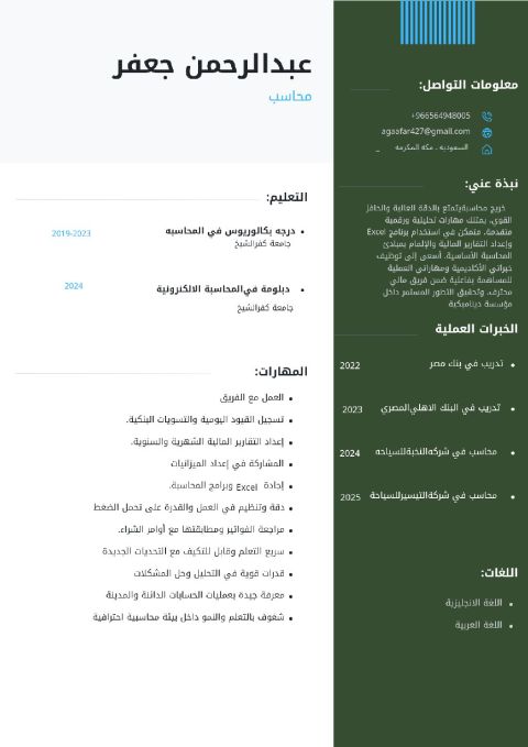 ابحث عن فرصة عمل في مجال المحاسبة، حيث امتلك خبرة لمدة ثلاث سنوات في اعداد القيود اليومية، التسويات البنكية، اعداد التقارير المالية، ومتابعة الحسابات والعمل على الأنظمة المحاسبية المختلفة. أتميز بالدقة في العمل، والقدرة على تحليل البيانات المالية، والعمل ضمن فريق لتحقيق أهداف المنشأة. للتواصل الجوال. البريد الألكتروني
