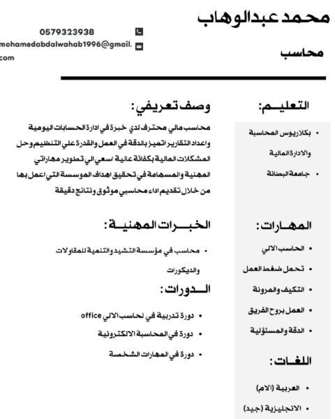 أنا محاسب مصري لدي اقامة سارية وجاهز لنقل الكفالة أجيد العمل علي Microsoft office ولدي خبرة ثلاث سنوات في ادخال البيانات ومتابعة البنوك العملاء والموردين واعداد القيود والتقارير المالية