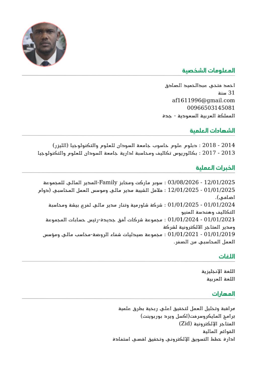 محاسب سوداني خبرة ست سنوات بالمحاسبة خمس منها بالمملكة العربية السعودية عملت بمجال المحاسبة المالية والتكاليف (مطاعم) وفق الأنظمة المحاسبية وأقفال القوائم المالية والمتابعة مع المراجعين وانشاء المتاجر الالكترونية من الصفر والتعامل مع تابي وتمارا وهنقر وجاهز وحساب التكاليف وضبطها وخبرة بالمواد الغذائية وادارة التسويق الرقمي والمنصات الحكومية ومنصة اعتماد متوفر سيارة ورخصة قيادة جاهز للعمل