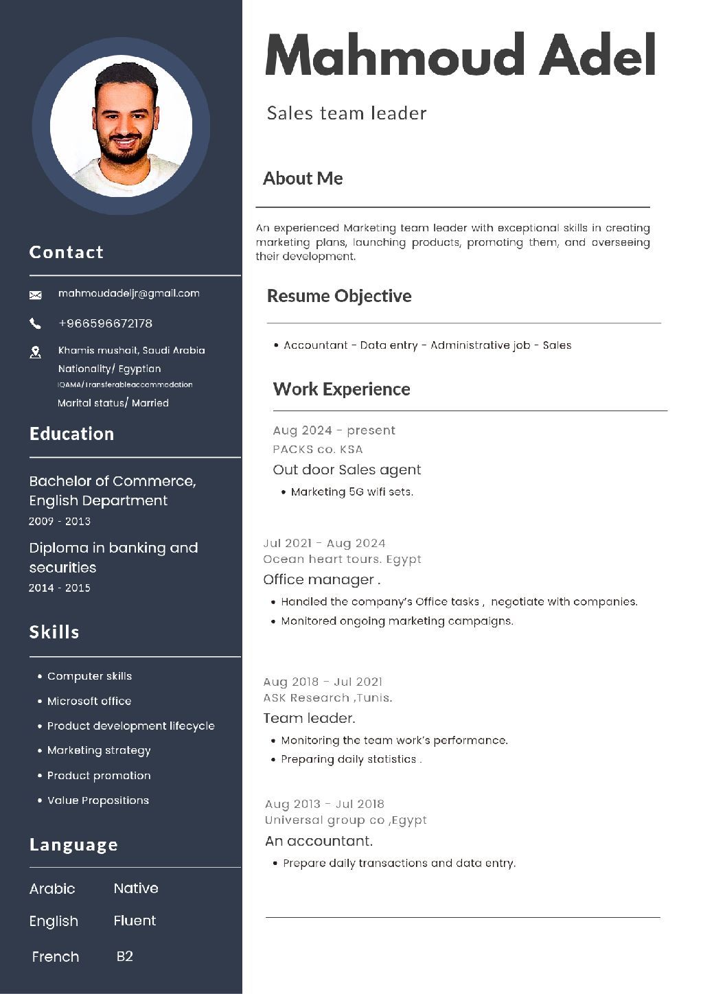 اسمي محمود عادل الجنسية مصري بكالوريوس تجارة قسم لغة انجليزية معي إقامة سارية قابلة للنقل الوظائف (محاسب - مدخل بيانات - مشرف - وظائف ادارية - استقبال) امكانية العمل في أي مكان في المملكة ليس مكان محدد ولكم جزيل الشكر