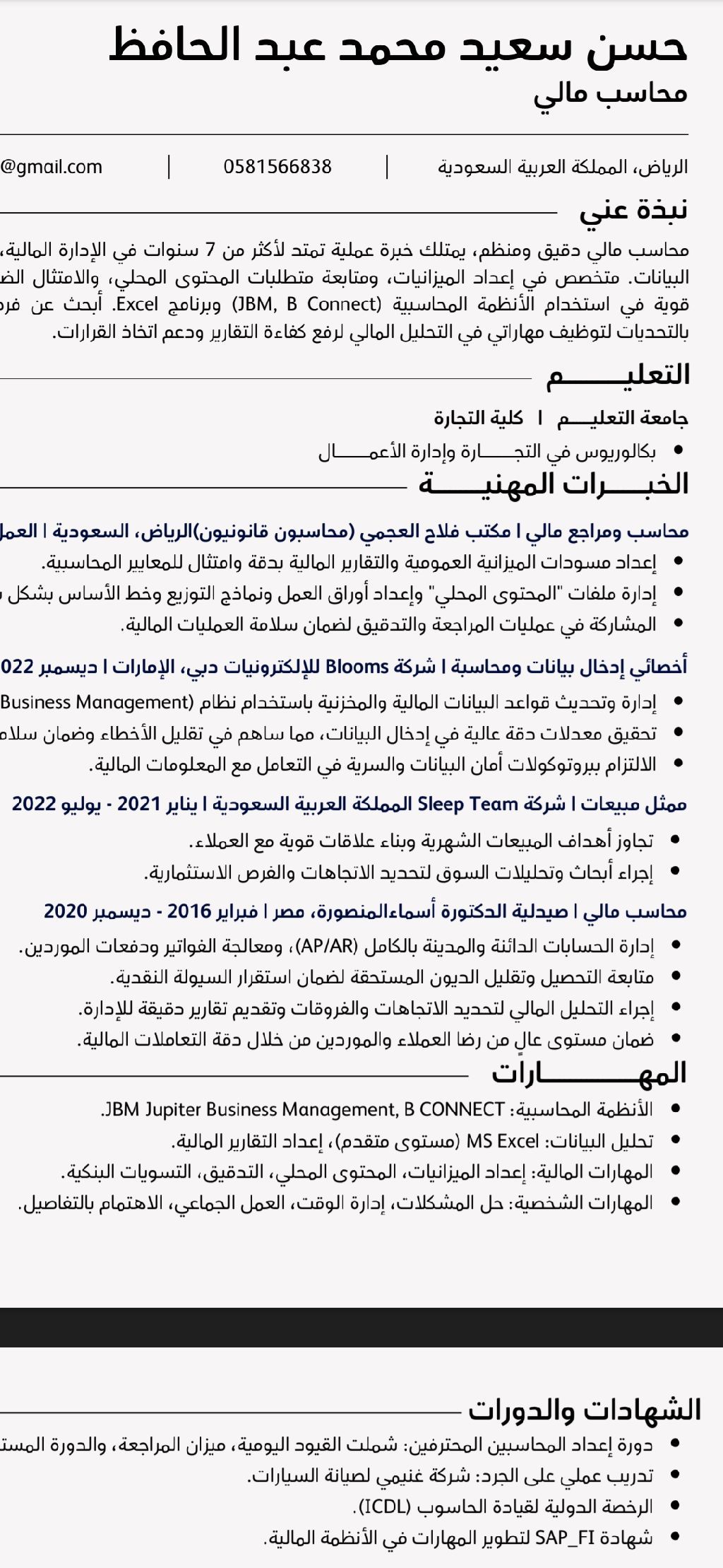 محاسب بخبرة في مكتب فلاح العجمي متخصص في المحاسبة والمراجعة وتجهيز ملفات المحتوى المحلي حتى اصدار الشهادة متمكن من اعداد وترتيب ملفات الميزانيات وأوراق العمل وفق المعايير، وخبرة كبيرة في برنامج قيود، ومعرفة بالتسويق والمبيعات، وأدرس حاليا SAP FI. جاهز للتوظيف الفوري. للتواصل