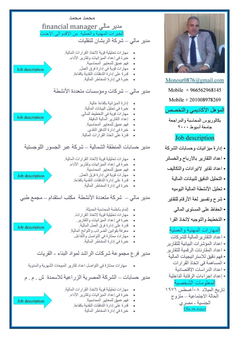 مدير مالي خبرة + 25 سنة خبرة في تأسيس وتنظيم ووضع الحلول لمشاكل الحسابات والدليل المحاسبي خبرة في التعاملات البنكية واعداد الميزانيات والأرباح والخسائر وقوائم التحليل المالي اجادة الكثير من برامج المحاسبة ERP، خبرة في رفع الزكاة والاقرار الضريبي، لديه خبرات سابقة في حسابات الشركات التجارية المصانع المجمعات الطبية الشركات اللوجستية مكاتب الاستقدام المدارس الأهلية